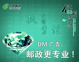 邮政DM:邮政广告是中国邮政利用自身网络及资源优势,为客户提供的媒体广告服务,邮政广告的种类有:信函广告、户外广告、报 刊广告、影视广告、礼品广告和社会代理广告六种,邮政广告具有覆盖全国的网络资源,位置优越的户外资源,发行报刊的渠道资源等因此可以 为客户提供全方位立体式的综合广告服务,是目前最具发展潜力的广告资源提供商。